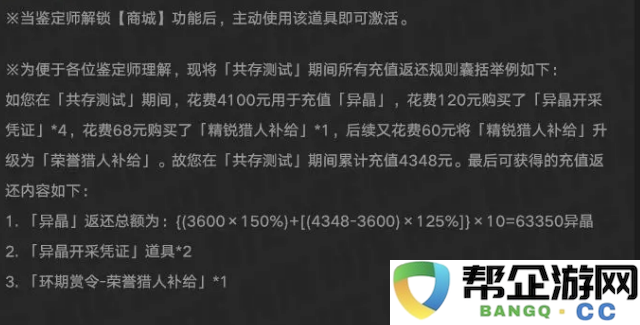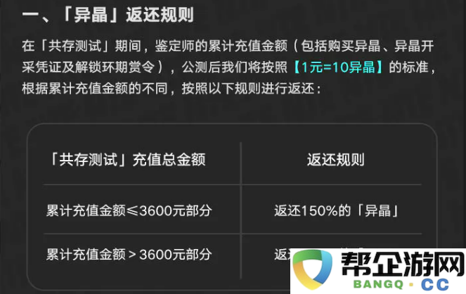 先说充值异晶的返还。测试期间充钱买异晶,公测后会按1块钱等于10个异晶来算。充值金额在3600块以内的部分,返还150%的异晶。超过3600块的那部分,返还125%的异晶。假如你充了5000块,那前3600块能拿回54000异晶,剩下1400块能拿回17500异晶,加起来就是71500异晶。这个返还比例算是相当不错了。