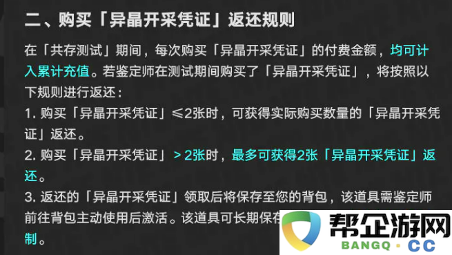 通行证的返还规则稍微有点复杂。游戏里叫异晶开采凭证,其实就是其他游戏的战令或者通行证。测试期间买这个凭证的钱,首先会按照上面说的异晶返还规则给你返异晶。除此之外,买凭证本身还有额外的返还。如果你买的凭证数量不超过2张,公测后会按实际购买数量返还凭证。要是买了超过2张,最多只返2张。返还的凭证会以道具形式发到背包里,需要自己去背包手动使用才能激活,而且这个道具没有使用期限,什么时候用都行。