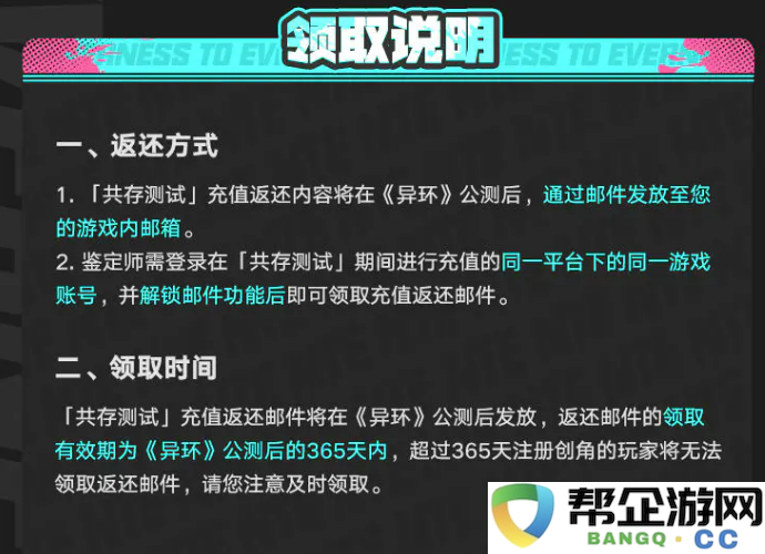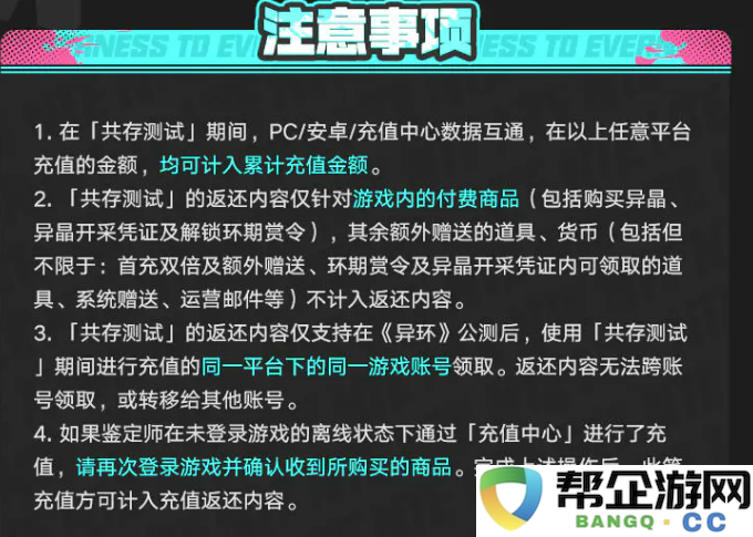 异环通行证返还规则是什么?最近异环开启了共存测试,很多玩家都在问测试期间花的钱会不会白花。其实官方早就公布了返还规则,而且返还力度还挺大的。今天小编就带来异环通行证返还规则介绍。测试期间充的钱不但不会亏,公测之后还能拿到更多东西回来。这次测试虽然会删档,但充值的部分全都会按照规则返还到公测账号里。下面给大家详细说说这个返还机制到底怎么算,特别是关于通行证这块的内容。