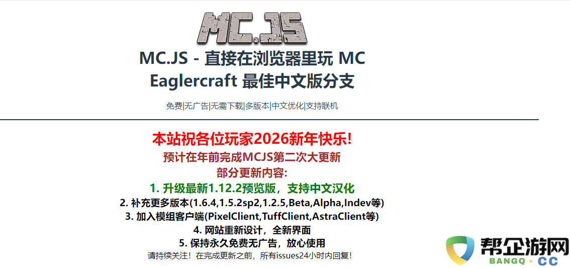 其它 Eaglercraft 分支项目确实有提供离线下载,但是因为 MC.JS 更新频繁,在线版本每隔一段时间会拉取最新代码进行构建,为了保证玩家都统一使用最新版本,MC.JS 暂不提供离线下载,未来可能会重新开放,敬请期待。